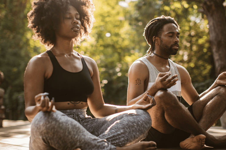 Práticas de Yoga e Meditação ao ar livre proporcionando equilíbrio e alívio do estresse.